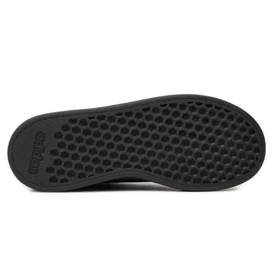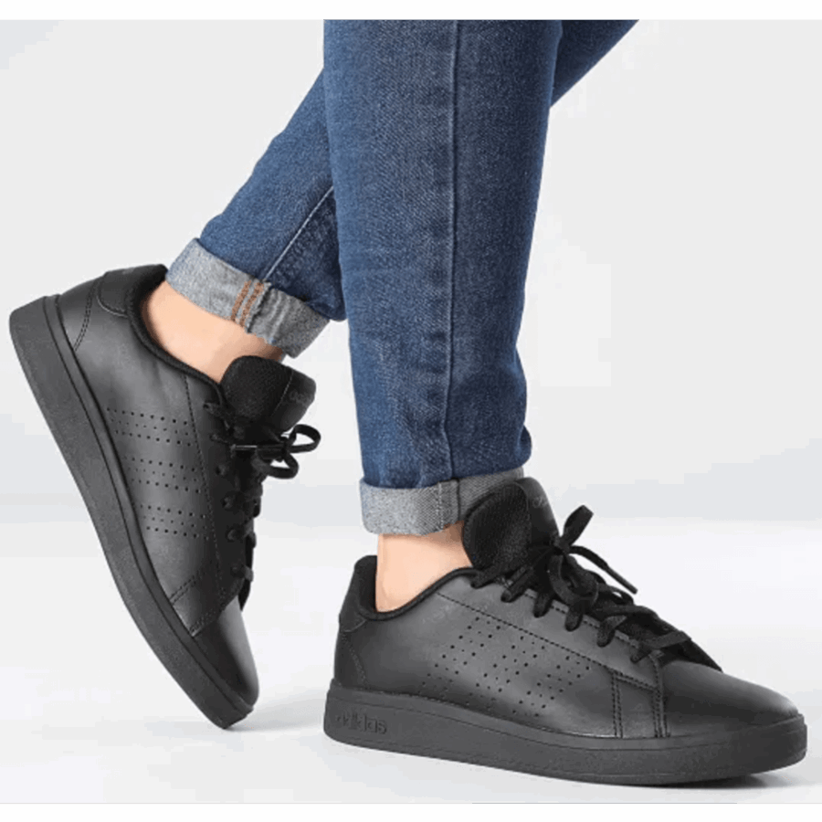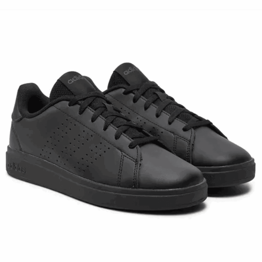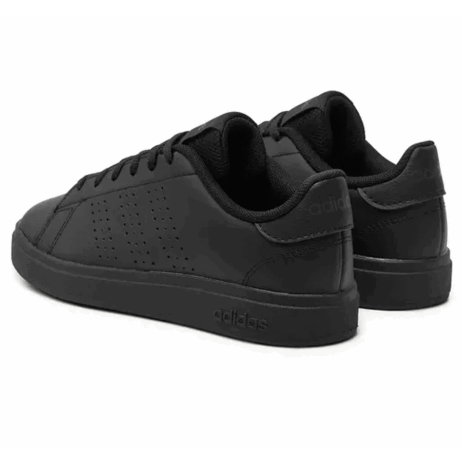Adidas Advantage Base 2.0 pour enfants, en noir. C’est une chaussure « décontractée » qui possède une tige légère avec des inserts synthétiques, un intérieur doux et une semelle extérieure en caoutchouc, conçue pour offrir confort et longévité.