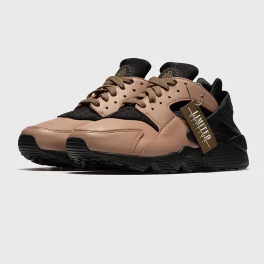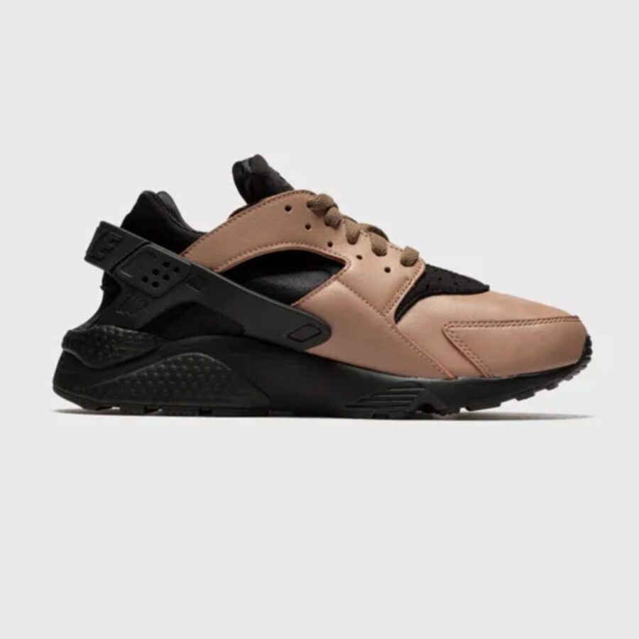 La Nike Air Huarache « Toadstool » est une chaussure de sport masculine rétro, dotée d’une tige en néoprène et cuir beige, d’un talon renforcé en TPU et d’une semelle en caoutchouc, alliant confort et look traditionnel.