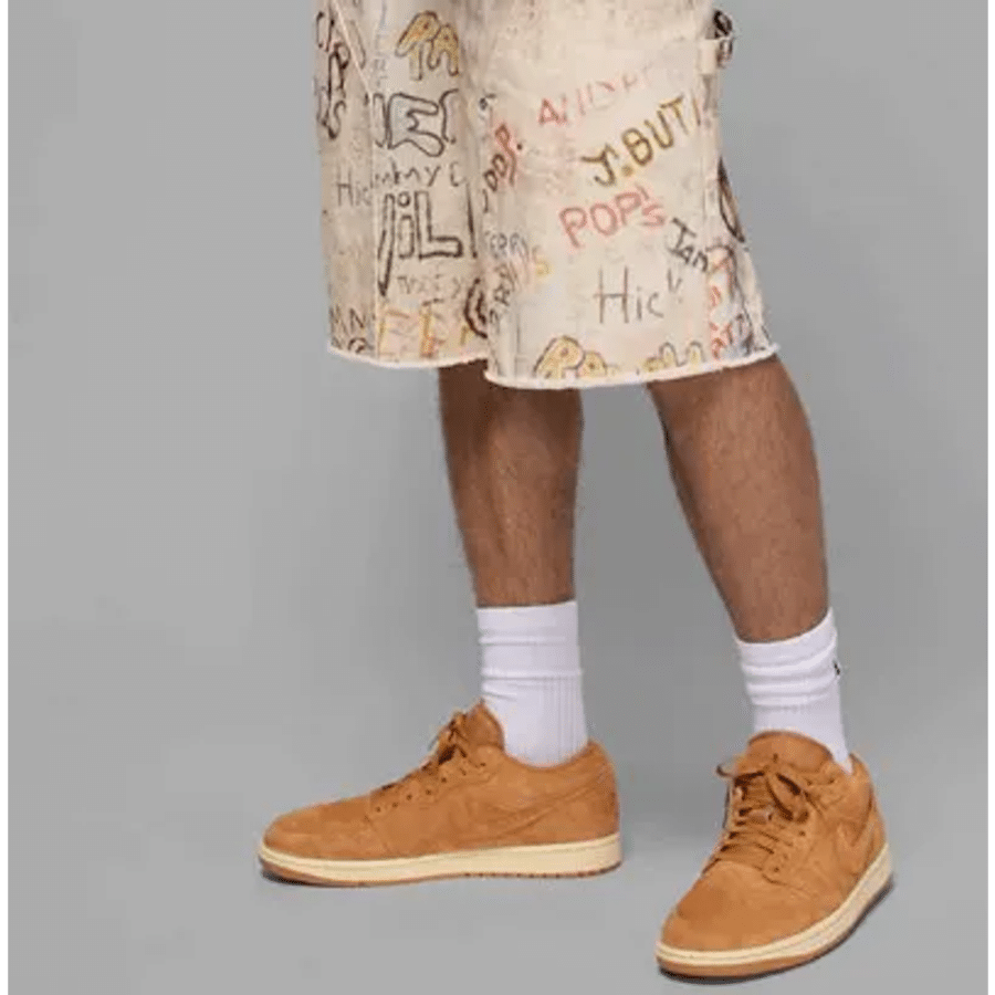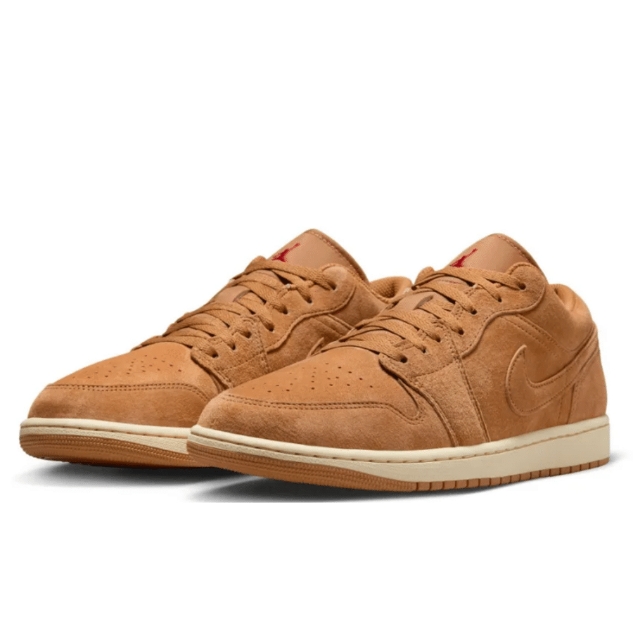 La Air Jordan 1 Low SE « Flax » est une chaussure pour homme inspirée de l’automne, combinant un nubuck beige/marron (« Flax ») avec des touches de Varsity Red. Attendue pour la fin de 2025, elle offre un style confortable grâce à sa semelle crème vieillie qui donne une allure rétro, ainsi qu’un Jumpman et des ailes (Wings) brodés.