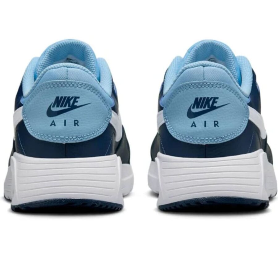 Nike Air Max SC pour homme, en teintes Psychic Blue-Midnight Navy-White (bleu psychédélique, bleu nuit et blanc). Ces baskets proposent un design intemporel doté de contours raffinés, une tige résistante en cuir, similicuir et mesh, ainsi qu’un amortissement léger grâce à l’unité Air transparente et une semelle intermédiaire en mousse, idéales pour une apparence sportive de tous les jours.
