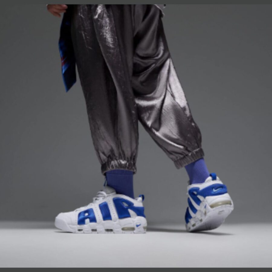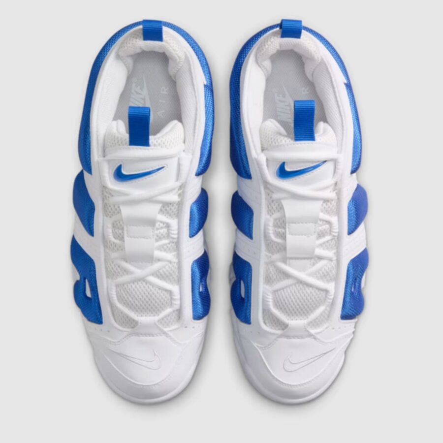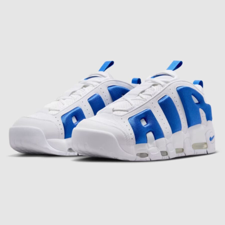 La chaussure Nike Air More Uptempo Low est disponible en teintes White/Hyper Royal-Psychic Blue. Il arbore une base blanche agrémentée de touches de bleu royal et de bleu psychédélique. Le style distinctif « AIR » est perceptible sur les flancs dans une forme basse.