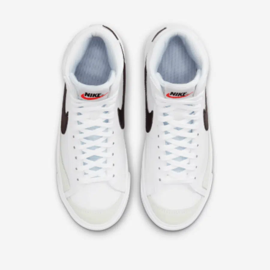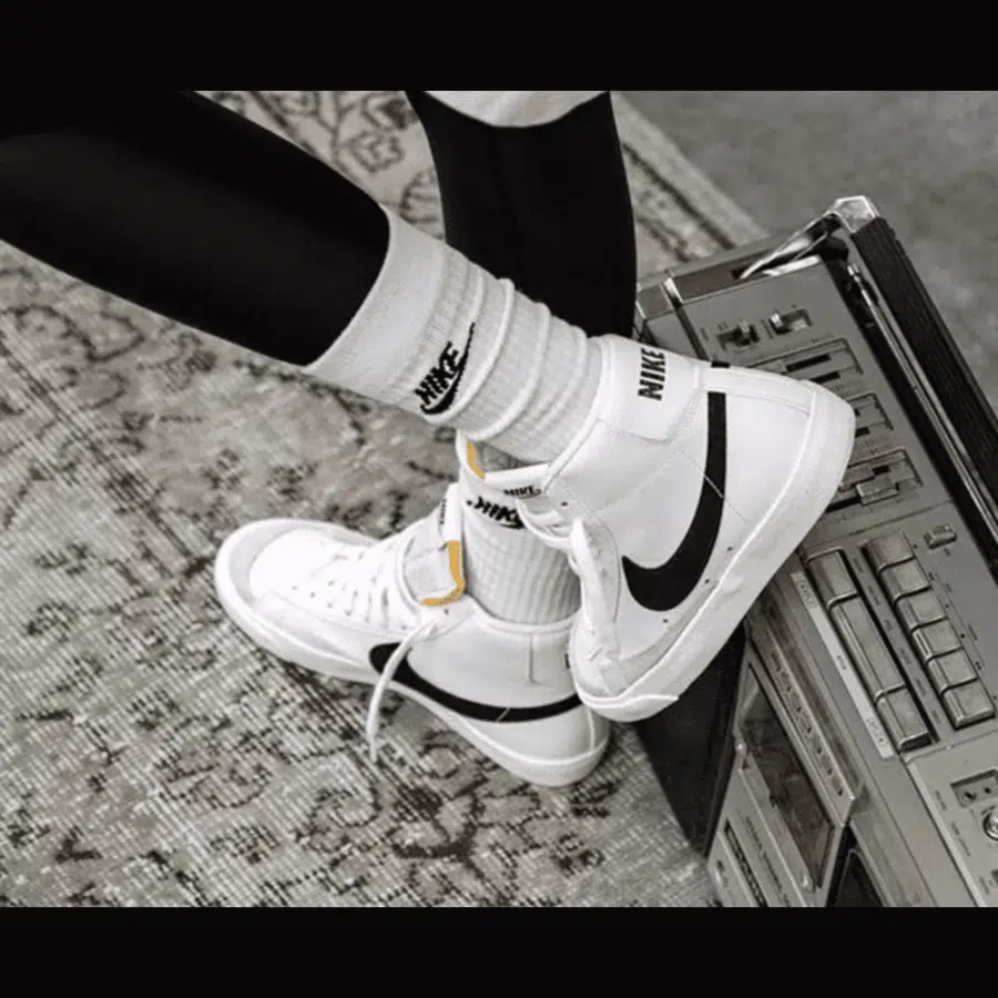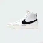 La Nike Blazer Mid ’77 (GS) est une chaussure de sport mi-haute pour enfants au design rétro, majoritairement blanche avec un Swoosh noir et des accents en daim. Elle s’inspire du basketball vintage et assure confort, support et longévité par sa semelle en gomme à motif en chevrons, parfaite pour un port quotidien.