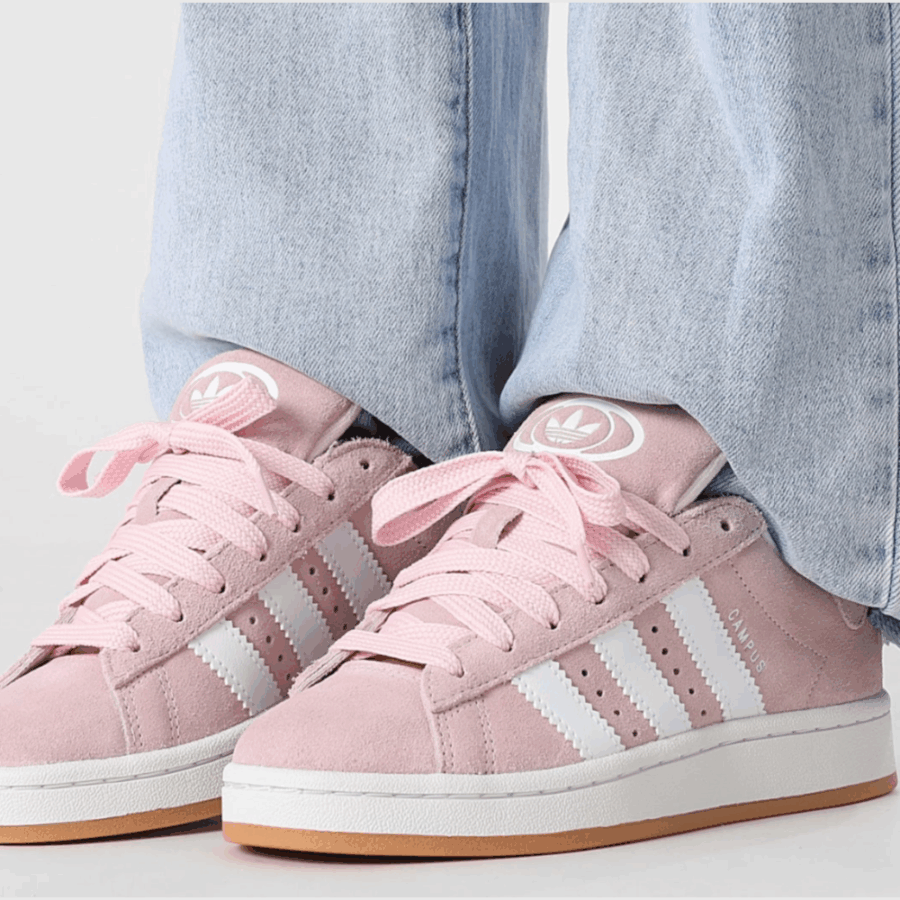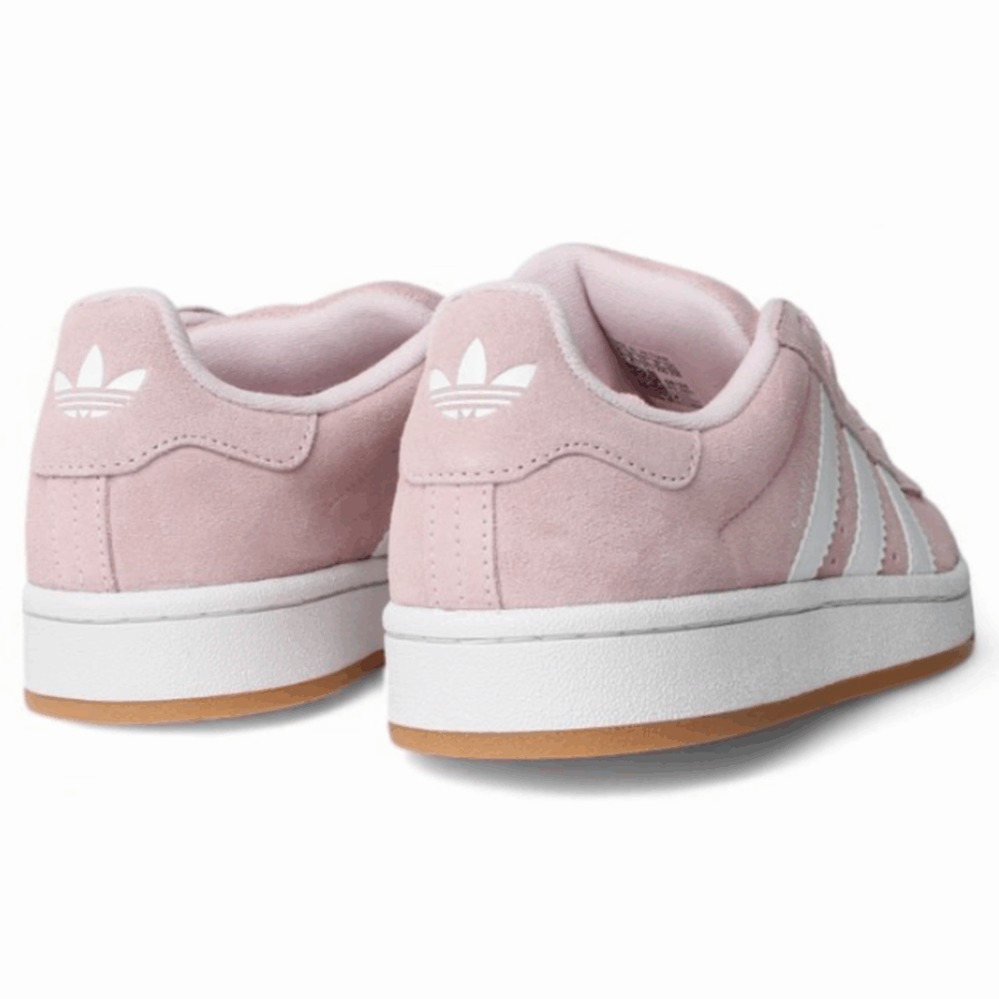 Sneaker, spécifiquement dans la teinte « Clear Pink / Cloud White / Gum », une chaussure destinée aux adolescents qui combine le style emblématique Campus des années 80 avec la culture du skateboard des années 2000. Elle arbore une tige en daim de couleur rose délicate, trois bandes en cuir, une semelle intermédiaire de teinte blanc cassé et une semelle extérieure en gomme (gum), offrant ainsi un style qui allie rétro et modernité.