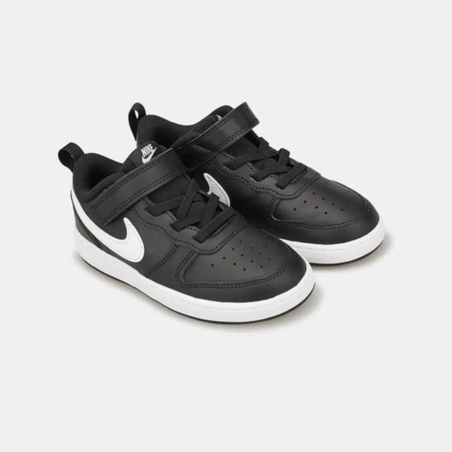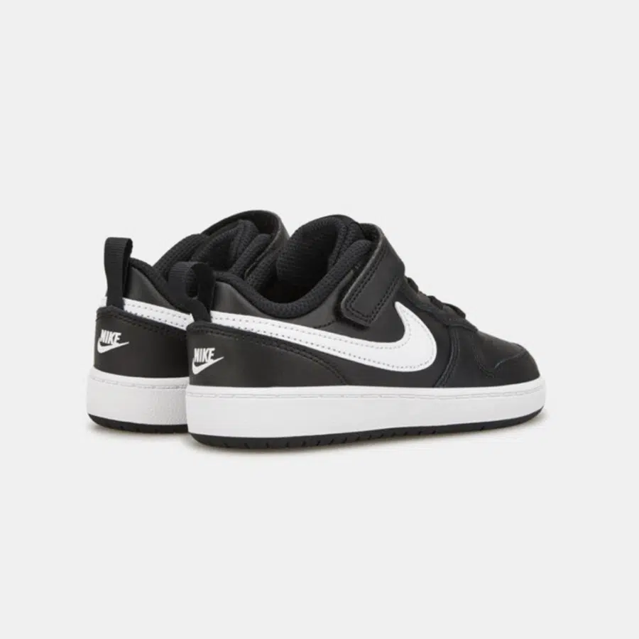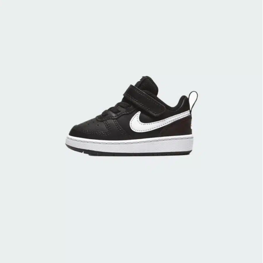 Nike Court Borough Low?2 TDV bébé noir/blanc avec semelle en caoutchouc antidérapant et double bande Velcro ajustable. Confort agréable et mise en place aisée pour une première expérience de marche en toute tranquillité.