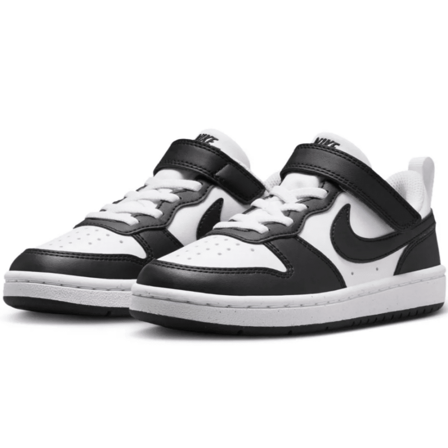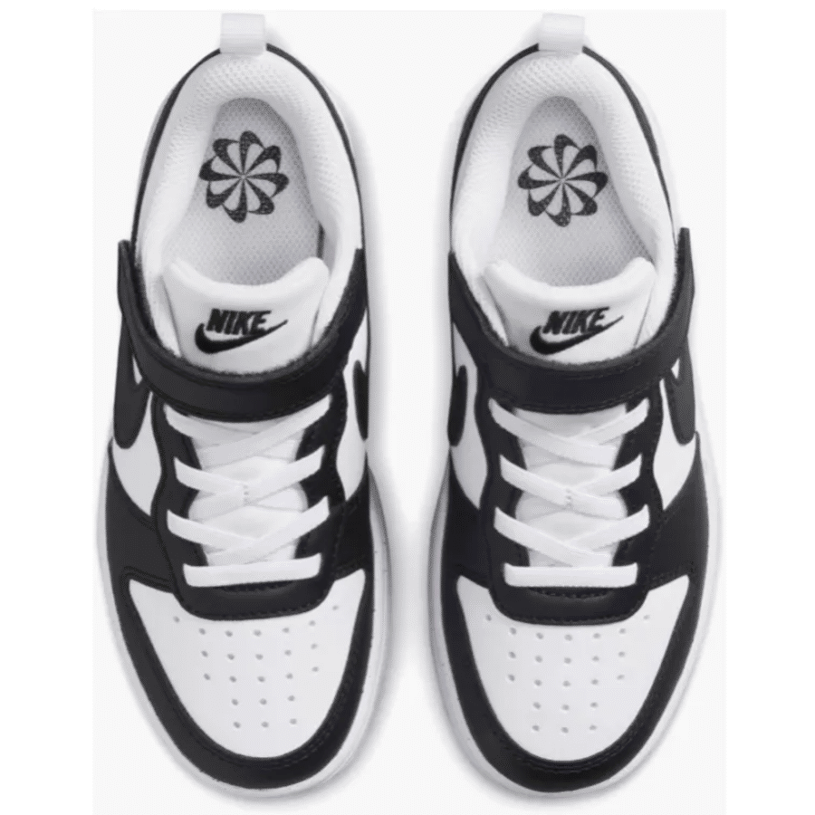 Souliers de style décontracté pour enfants, combinant l’esthétique traditionnelle du basketball à une fabrication écoresponsable (matériaux recyclés). Elle présente une couleur blanche/noire avec des lacets élastiques pour un chaussage aisé, des stries flexibles sur la semelle extérieure et une conception durable.