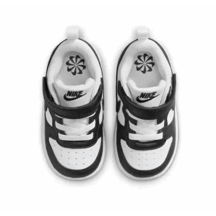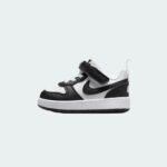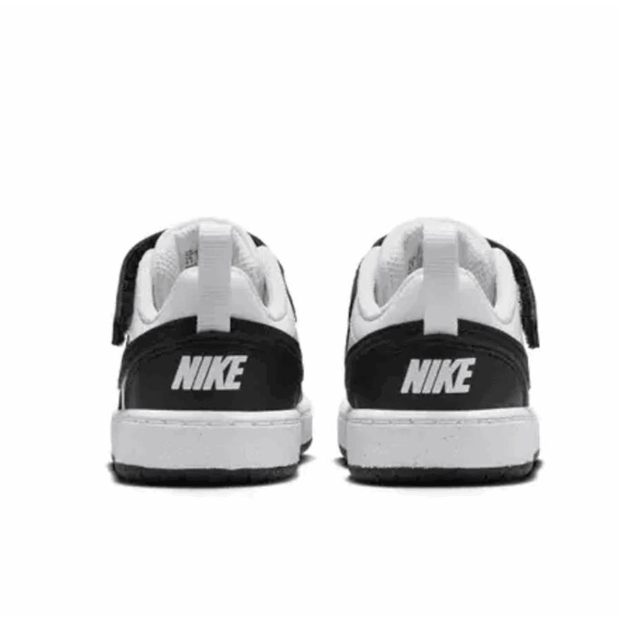 Une paire de chaussures pour bébé ou petit enfant (TD – Toddler), alliant un design traditionnel blanc et noir (White/Black) à des matières durables. Fabriquée à partir de matériaux recyclés, ce produit assure une robustesse supérieure, une pointe remodelée pour un mouvement libre et une semelle en cuvette stable.