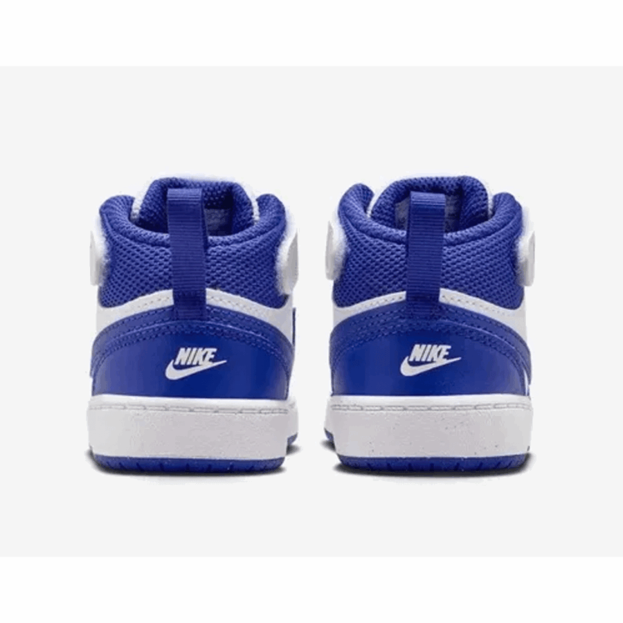 On parle ici des chaussures Nike Court Borough Mid 2 pour bébé/tout-petit (modèle montante – TDV). Ce modèle « White/Deep Night » au design rétro de basketball propose un support à la fois structuré et agréable, équipé d’une bande auto-agrippante pour un enfilage aisé.