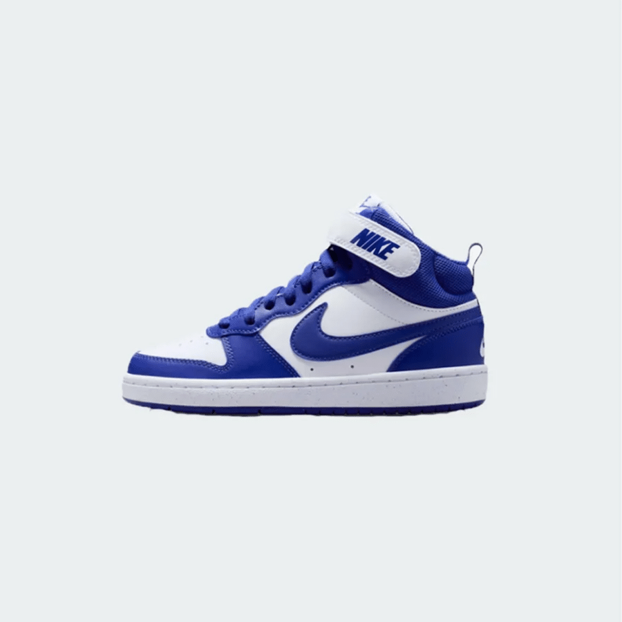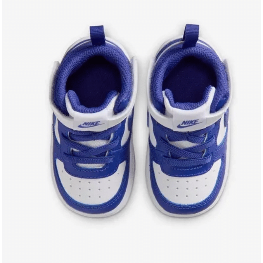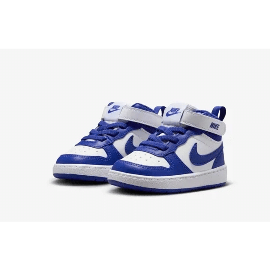 On parle ici des chaussures Nike Court Borough Mid 2 pour bébé/tout-petit (modèle montante – TDV). Ce modèle « White/Deep Night » au design rétro de basketball propose un support à la fois structuré et agréable, équipé d’une bande auto-agrippante pour un enfilage aisé.