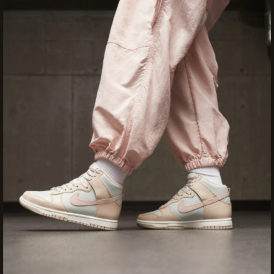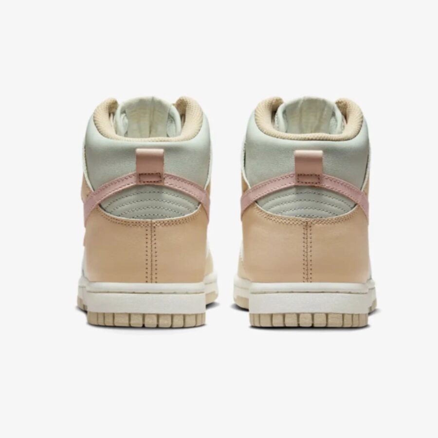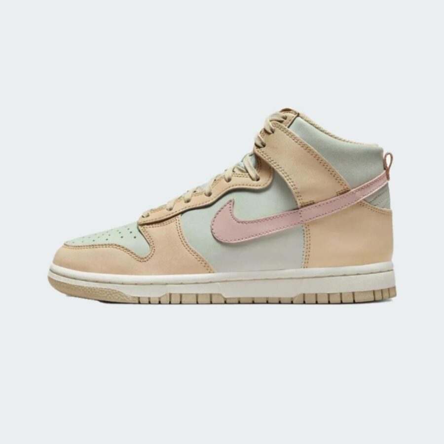 Sneaker Nike WMNS Dunk High pour dames, disponible en teintes sanddrift/pink oxford/light silver/sail. Il s’agit d’une chaussure de sport de la marque Nike, destinée à une clientèle féminine.