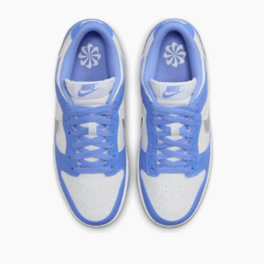 la Nike Dunk Low pour femme est conçue en cuir de haute qualité avec des détails en blanc et bleu pâle offrant un look élégant tout en gardant une touche dynamique. Les lacets bleus et les insignes Swoosh en cuir argenté sur les flancs ajoutent une subtile marque distinctive.