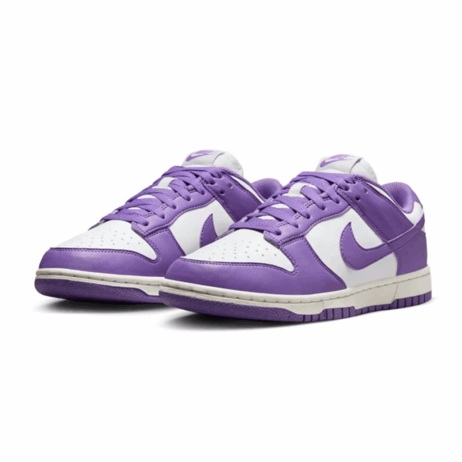 La Nike Dunk Low Next Nature Black Raspberry pour femme se caractérise par une tige en cuir lisse de couleur Summit White comme matériau principal. Cette teinte s’étend sur les flancs, la tige trouée et la région de la cheville. Le bout de la chaussure, les œillets, la bride de cheville et le talon sont constitués d’inserts légèrement brillants de couleur **Black Raspberry** (violet framboise foncé), tout comme les Swooshes Nike qui ornent les flancs.