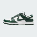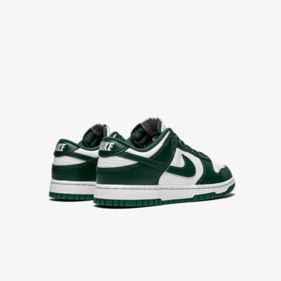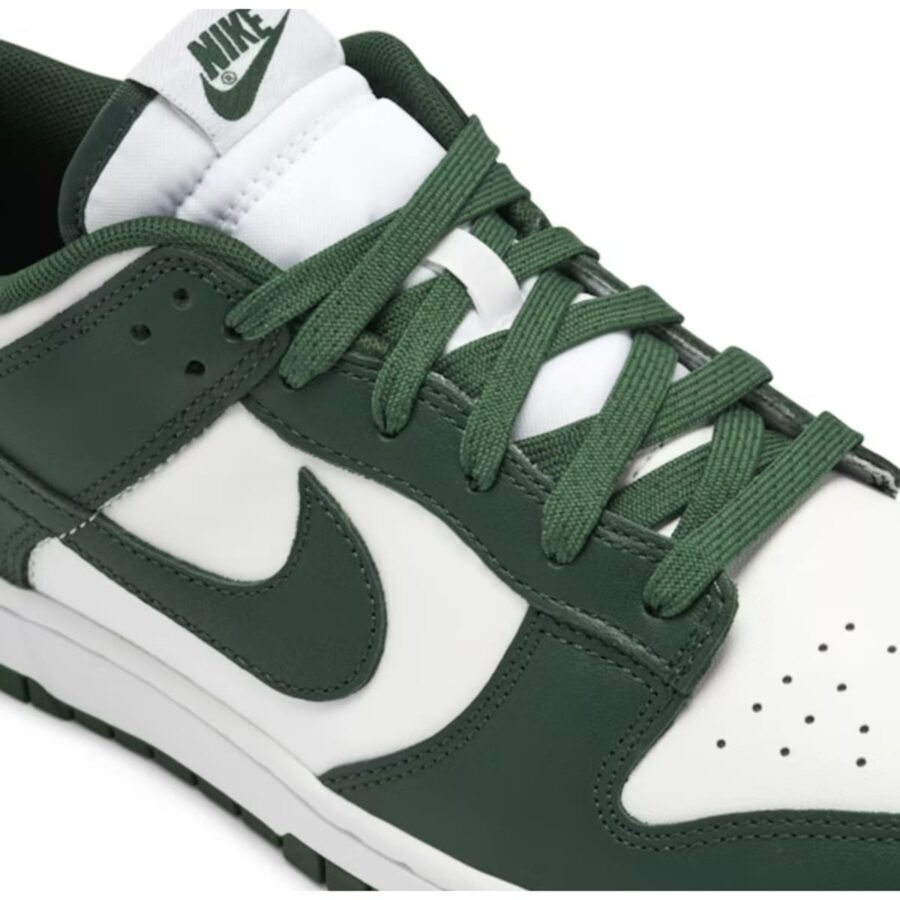 Nike Dunk Low Retro en teinte « Michigan State », une chaussure très prisée avec un dessus en cuir blanc et des accents vert bouteille, qui évoque les couleurs universitaires d’origine. Elle est équipée d’une semelle en caoutchouc et présente un design traditionnel, idéal pour un usage quotidien et le style urbain.