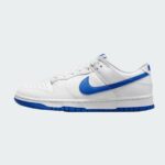 Le Nike Dunk Low White Hyper Royal reprend la silhouette emblématique du Nike Dunk Low et propose une palette de couleurs rétro inspirée par le Summit White et le Hyper Royal. Cette combinaison de deux teintes confère à la sneaker une esthétique nette et épurée qui rappelle les vêtements de sport universitaires des années 80.
