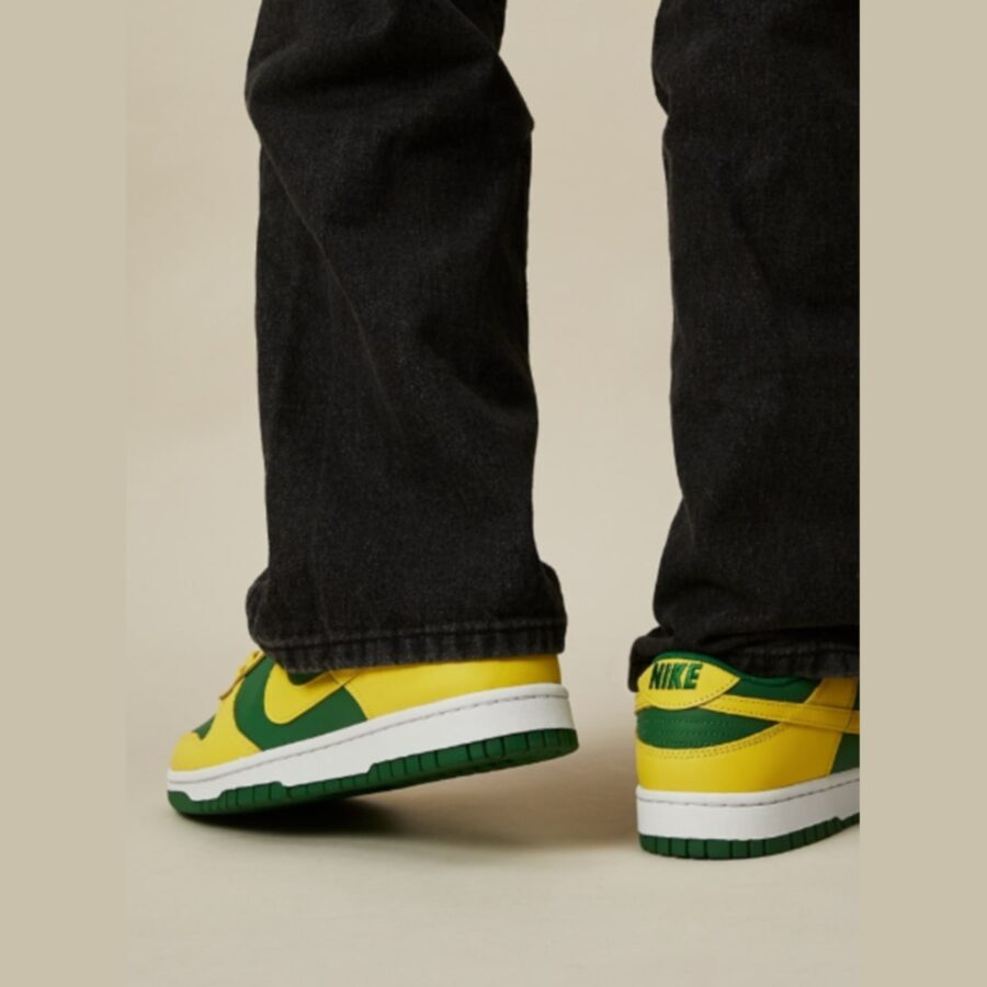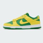 La Nike Dunk Low « Reverse Brazil » est une chaussure de sport basse au design vintage, dotée d’une tige en cuir vert et jaune, parfaite pour un style décontracté ou streetwear.