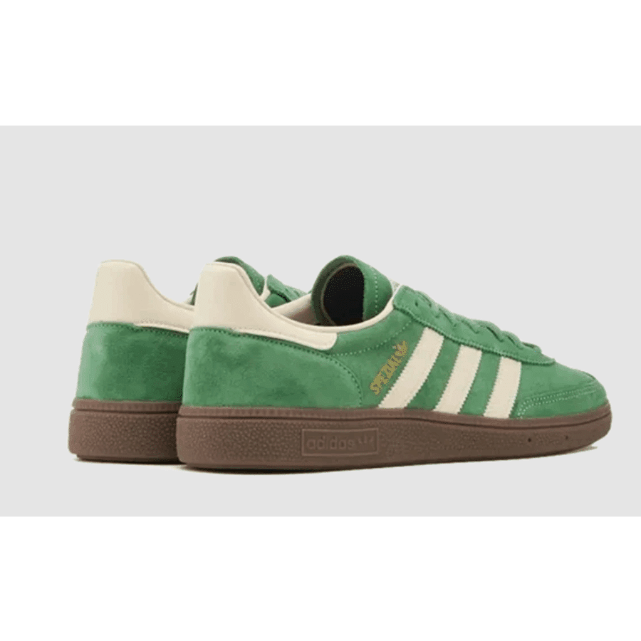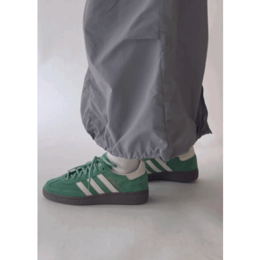 Sneakers classiques à allure vintage, originellement destinées aux activités en intérieur dans les années 70. Ce modèle est caractérisé par sa teinte vert pré (Preloved Green) avec des touches de blanc crème (Cream White), une partie supérieure en matériau synthétique et daim, ainsi qu’une semelle extérieure en caoutchouc gomme pour une accroche optimale.