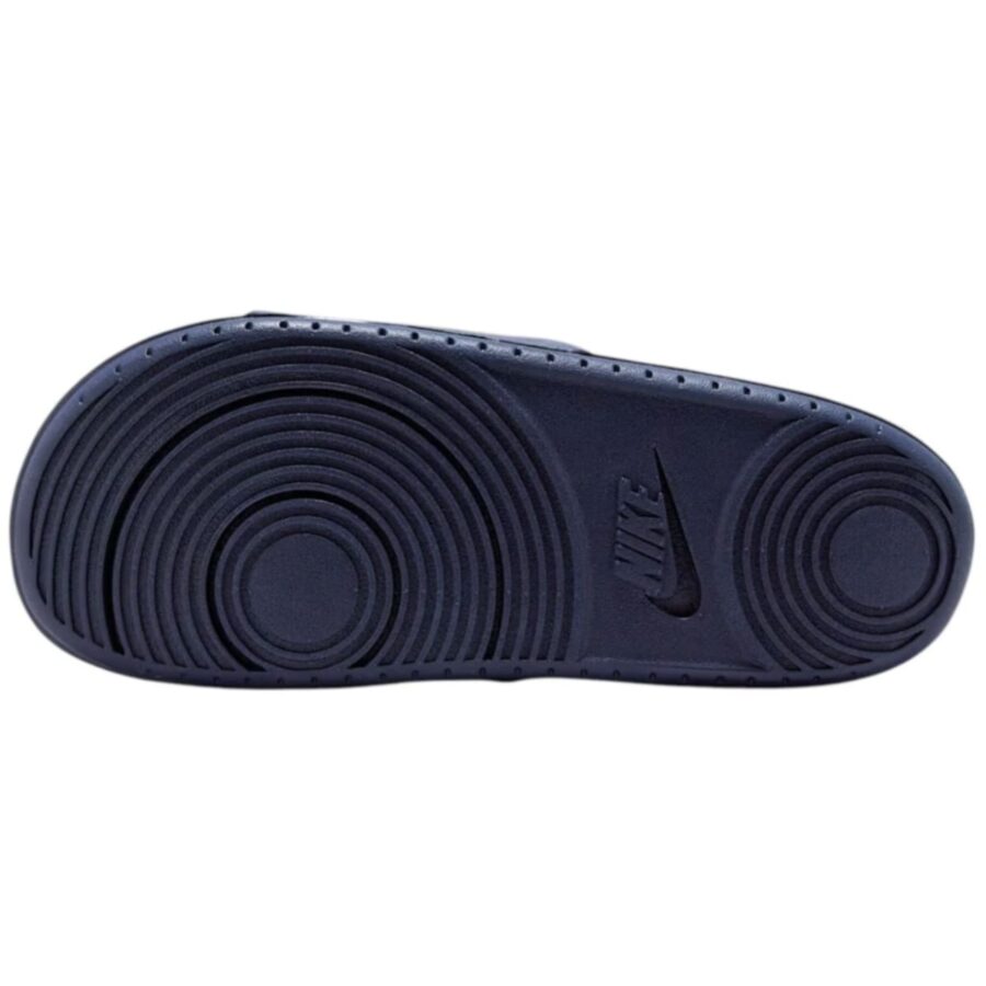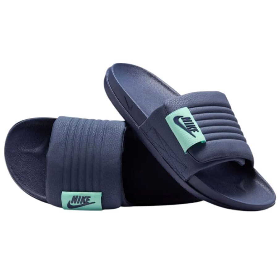 Les Nike Offcourt Adjust Slide sont des sandales pour hommes (aussi appelées mules) de teinte Bleu Marine (Midnight Navy) rehaussée d’accents Vert Menthe (Mint Foam). Elles sont spécialement conçues pour le confort après l’effort (suite à une activité sportive, une baignade, une sortie à la plage) grâce à leur bride ajustable rembourrée, leur semelle intermédiaire en mousse légère et leurs excellentes propriétés antidérapantes.