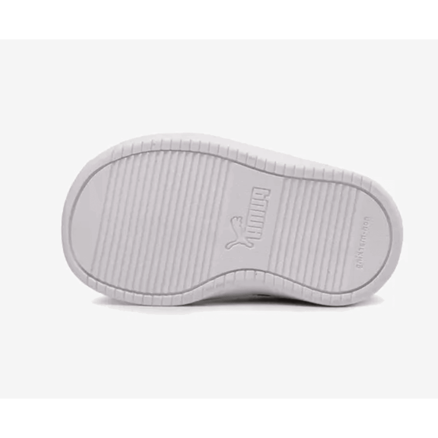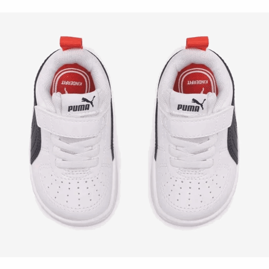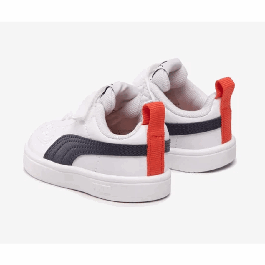 Des chaussures de sport pour enfants Rickie AC INF, essentiellement de couleur blanche. Destinées aux jeunes enfants, ces chaussures basses combinent un look traditionnel avec des matières synthétiques résistantes, ce qui simplifie leur nettoyage. Ces chaussures sont équipées d’une fermeture à bandes auto-agrippantes (type scratch) pour un enfilage aisé et possèdent une semelle en caoutchouc assurant une bonne adhérence.