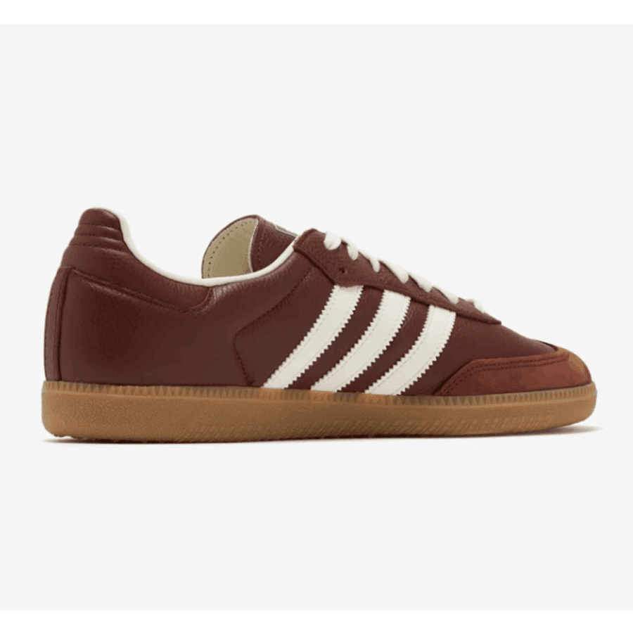 adidas Samba OG en teinte « Fox Brown / Off White / Gum ». Cette sneaker basse traditionnelle pour homme se démarque par une tige en cuir marron texturé, des inserts en nubuck et trois bandes de cuir, le tout reposant sur une semelle en caoutchouc. Elle propose une coupe standard dotée d’une fermeture à lacer.