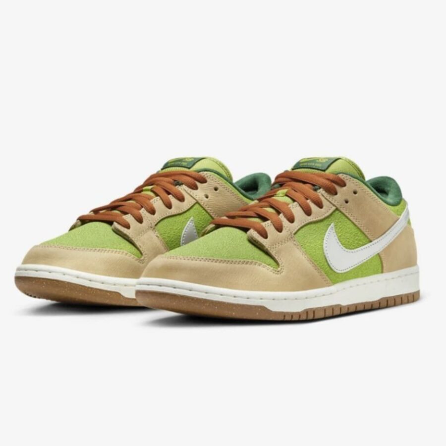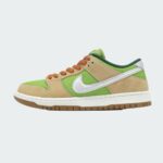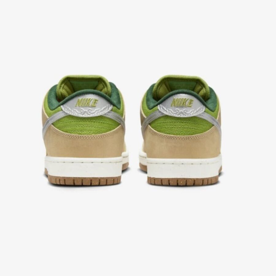 Le modèle Nike SB Dunk Low Escargot présente une semelle en daim doux de couleur Pear, agrémentée de superpositions en cuir lisse d’une nuance Sesame plus intense. Cette palette de couleurs atypique symbolise le beurre à l’ail et le persil, ingrédients utilisés dans la confection des escargots. En restant fidèle à son héritage de skateboard, cette version de la SB Dunk Low offre un rembourrage généreux au niveau de la languette et du col.