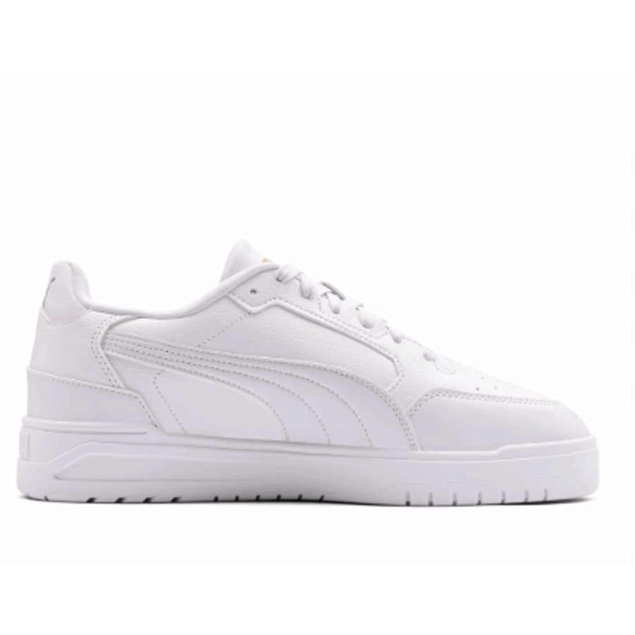 Les baskets Puma Shuffle Downtown junior, un modèle blanc souvent rehaussé de détails dorés (Puma Gold). Destinées aux enfants ou juniors, elles suivent une tendance streetwear traditionnelle, avec une coupe semi-haute ou basse, et garantissent un confort optimal pour une utilisation quotidienne.