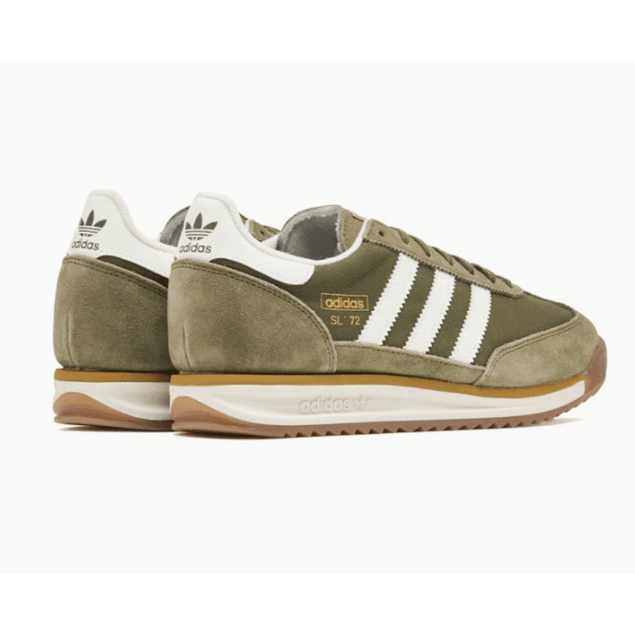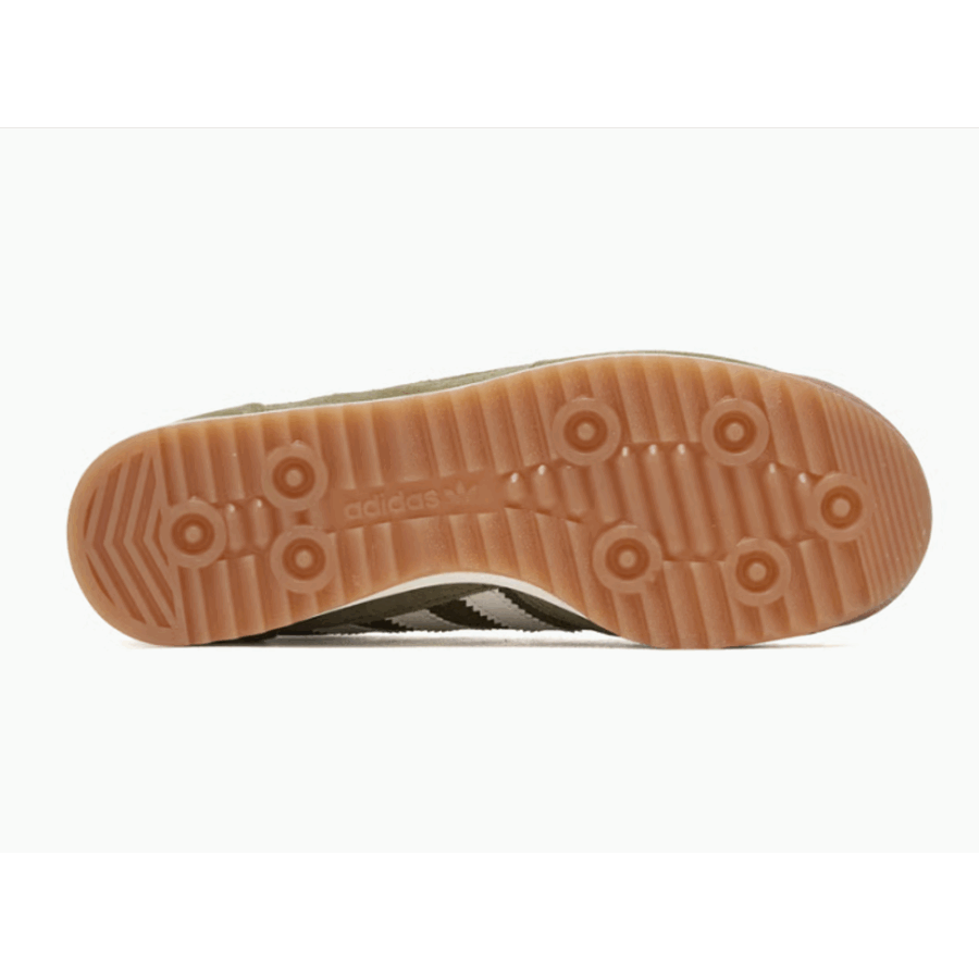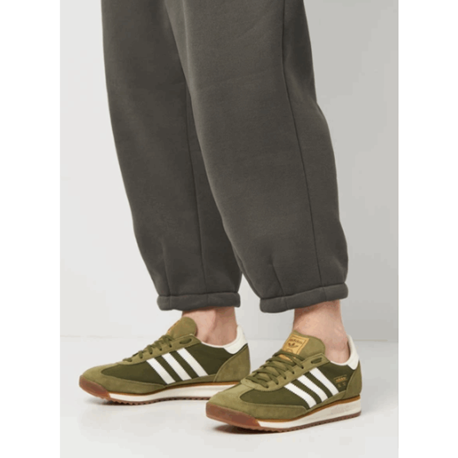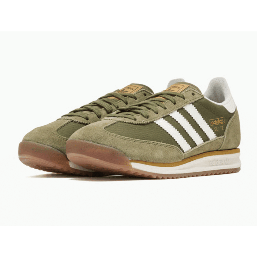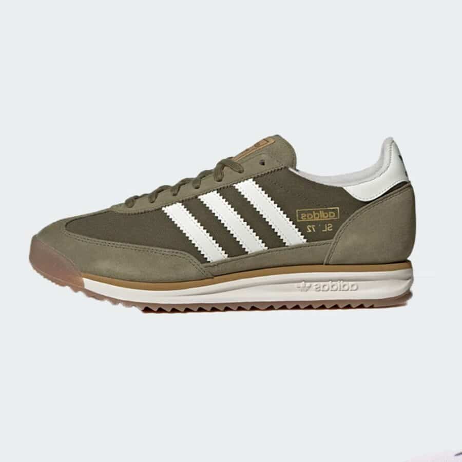 Sneaker rétro mise à jour, arborant une teinte « Focus Olive/Off White/Golden Beige » (vert olive, blanc cassé, beige doré). Elle est dotée d’une tige en nylon renforcée par du suède, d’une semelle intermédiaire en EVA pour l’absorption des chocs et d’une semelle extérieure en caoutchouc. Il s’agit d’une réimpression du modèle traditionnel.
