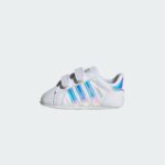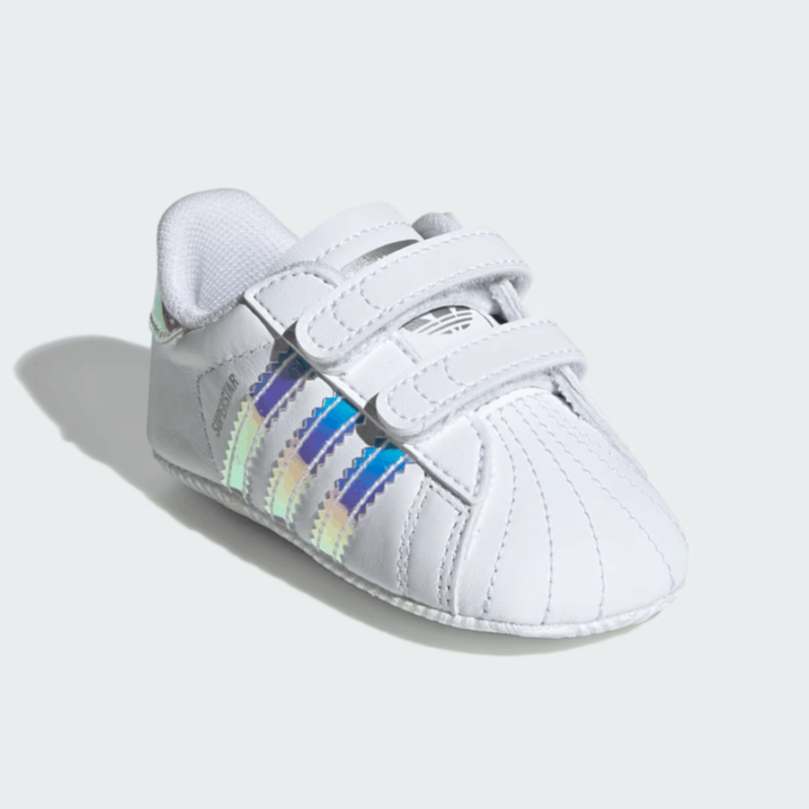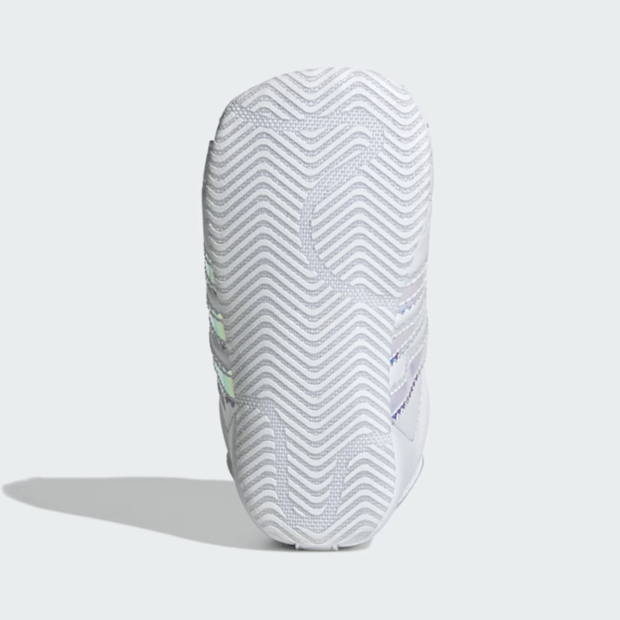 Chaussures Adidas Superstar pour bébé Taille standard. Fermeture à bande auto-agrippante. Semelle en cuir. Semelle extérieure tissée dotée d’un motif en caoutchouc qui empêche le glissement. Adapté au port. Teinte du produit : Cloud White