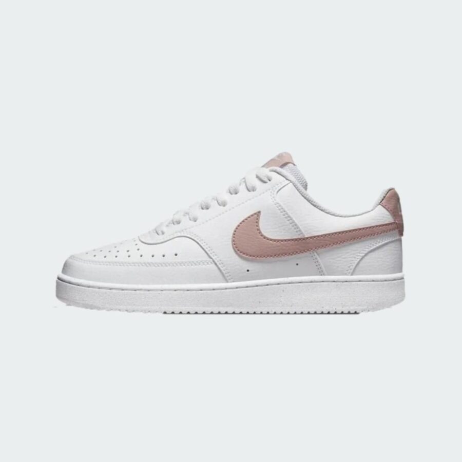 Les Court Vision Blanc & Rose se distinguent par leur esthétique classique, dotée d’une tige blanche en cuir artificiel de qualité supérieure. Elles sont ornées d’accents rose sur le logo Nike et d’autres éléments, apportant une nuance de couleur et de raffinement à leur allure générale.